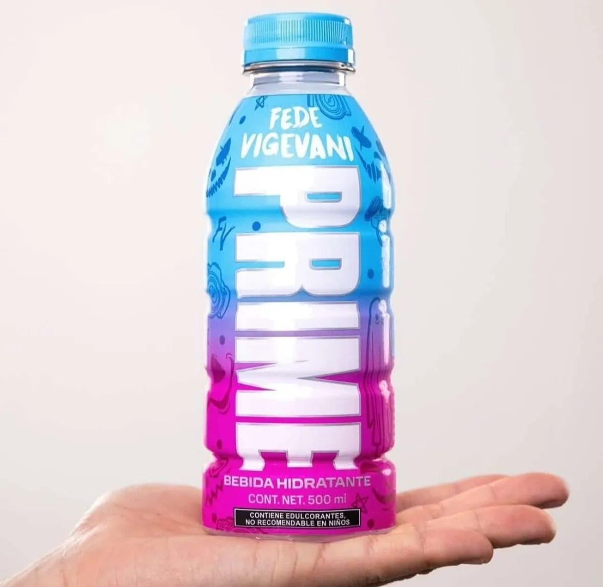 Prime Fede Vigevani es la nueva y exclusiva edición limitada de Prime Hydration en México, creada en colaboración con el fenómeno de internet Fede Vigevani. Con un diseño de botella en degradé rosa a azul, esta edición resalta tanto por su estética como por su refrescante sabor clásico Berry Freeze.